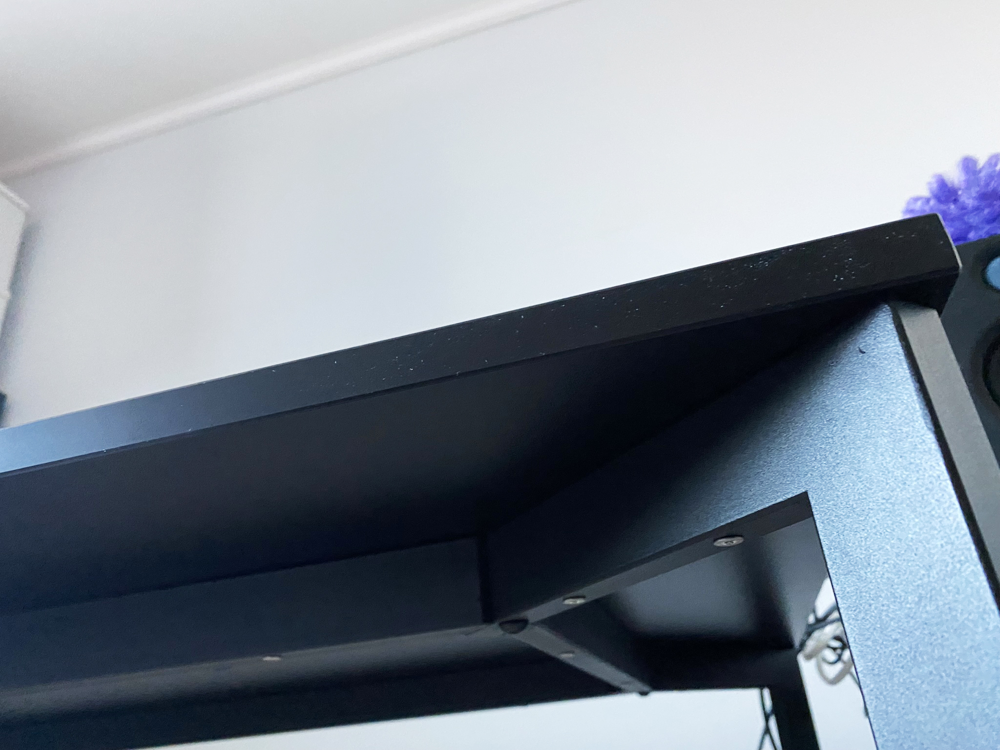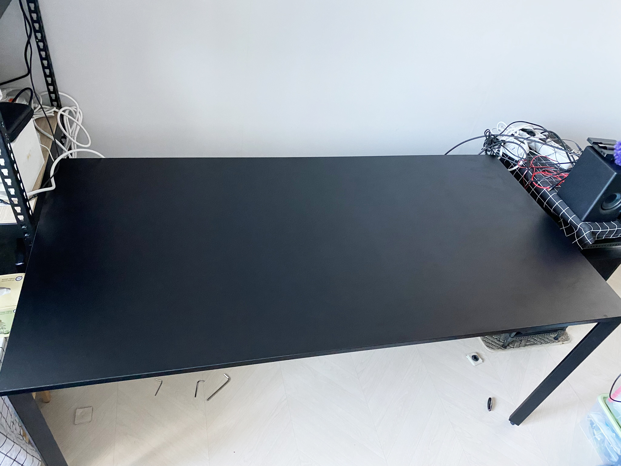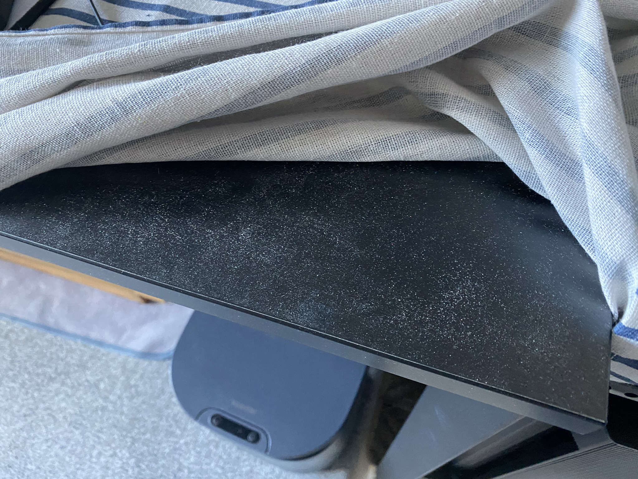 먼저 책상을 덮은 넓은 천을 빼는 것이었습니다. 먼지를 매일 털기가 싫어서 처음 세팅을 할 때 미리 천으로 덮었었죠. 하지만 먼지가 제 눈에 보이지 않는다고 제 방에 없는 건 아니었습니다. 천을 들어 올리자 보이는 먼지... 하필 책상도 검은 색이라서 수북히 쌓인 것들이 두드러졌습니다.