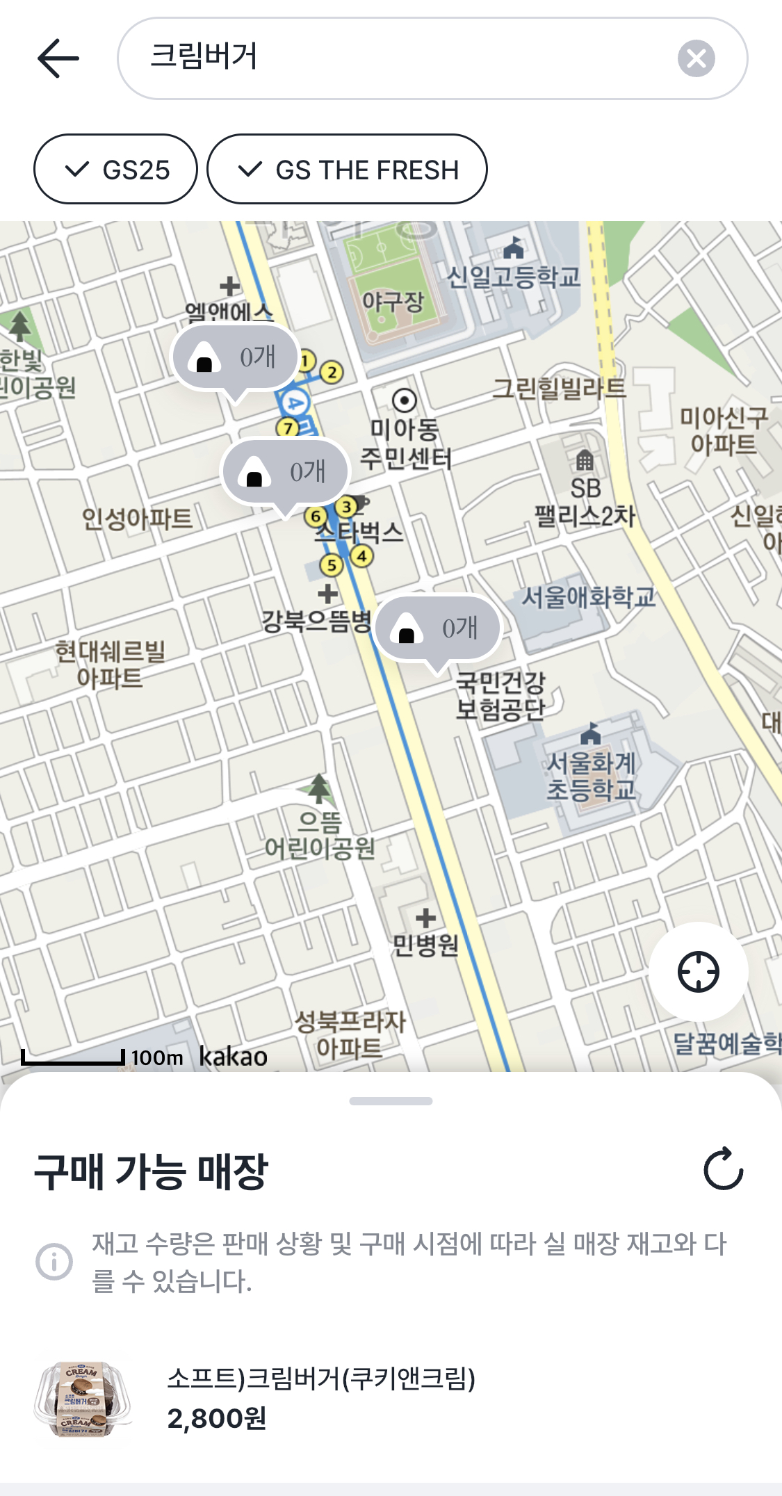 그런데 아무리 찾아봐도 저희 동네 주변에서는 소프트 크림버거 재고가 없었습니다. 재고 확인은 우리동네GS라는 어플을 통해 하는데요. 재고 데이터와 실제 매장 보유 유무가 다를 수도 있겠지만 서울 곳곳을 찾아봐도 나오지 않았습니다. 매일 체크를 했는데도 말이죠. 재고가 없다고 나오니 '아 괜히 이거 골랐네'라는 마음이 올라왔습니다.