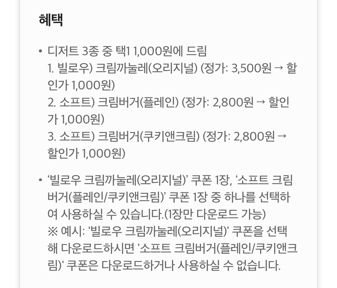 소프트 크림버거 외에도 빌로우 크림까눌레라는 것을 선택할 수도 있었습니다. 빌로우 크림까눌레가 3,500원인데 이걸 1,000원에 먹을 수 있는 거니 가격으로는 이게 더 나을 겁니다. 그렇지만 아무래도 오랜만에 크림을 좀 섭취하고 싶었기 때문에 요걸 골랐습니다. 소프트 크림버거는 원래 가격이 2,800원인데 0day 쿠폰을 이용하면 1,000원에 구매할 수 있습니다.