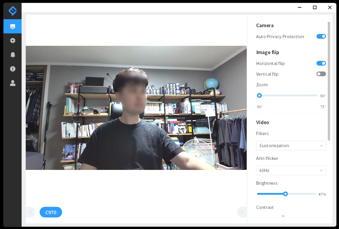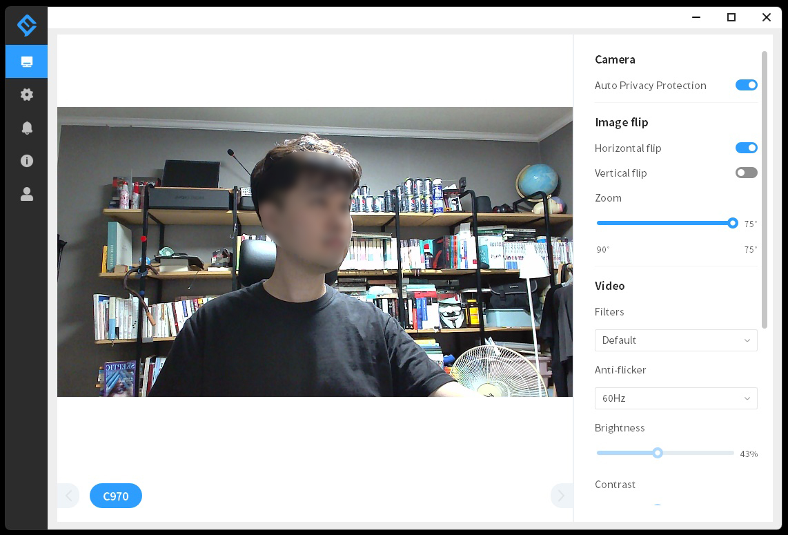 웹캠USB가 연결이 된 상태로 EMEETLINK를 열면 화면이 나옵니다. 로지텍 전용프로그램처럼 말이죠. 화면 우측에는 조정가능한 옵션들이 나열되어 있습니다. 앞서 말씀드린 사생활 보호 기능도 Off로 바꿀 수 있고요. 좌우반전, 상하 반전 등이 가능합니다.