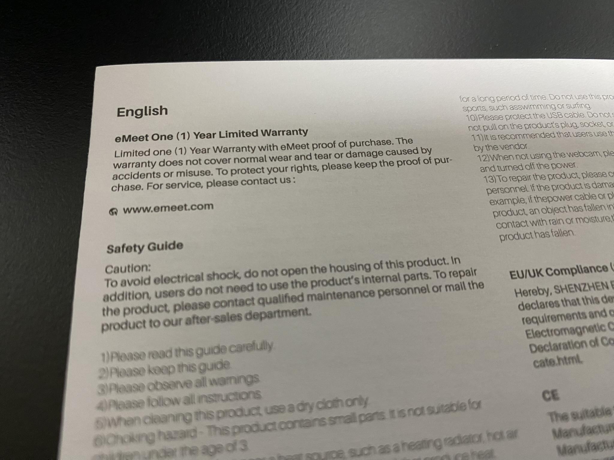 설명서에는 한글이 없습니다. 그렇지만 짧은 영어실력이라도 충분히 읽을 수 있습니다. 중요한 내용으로는 1년의 워런티가 있다는 점과 eMeetLink라는 프로그램을 다운받아서 카메라를 조정할 수 있다는 점입니다. 요건 이따가 말씀드리도록 하죠.