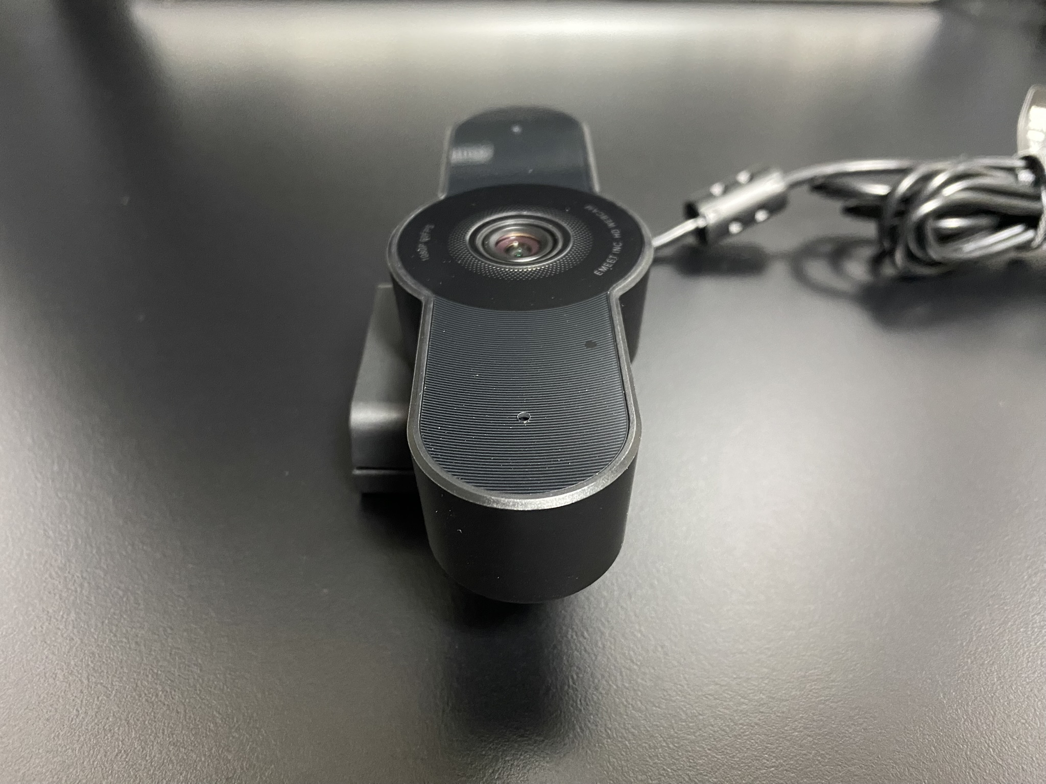 로지텍 c920과 크기를 비교해보았습니다. C970이 가로가 상당히 길죠. 로지텍c920의 규격이 94*43*71(가로, 높이, 깊이)인 반면에 EMEET C970의 규격은 120*44*53입니다. C970의 가로가 양옆으로 1cm 정도씩 길고, 대신 깊이가 1cm씩 짧다고 보시면 됩니다.