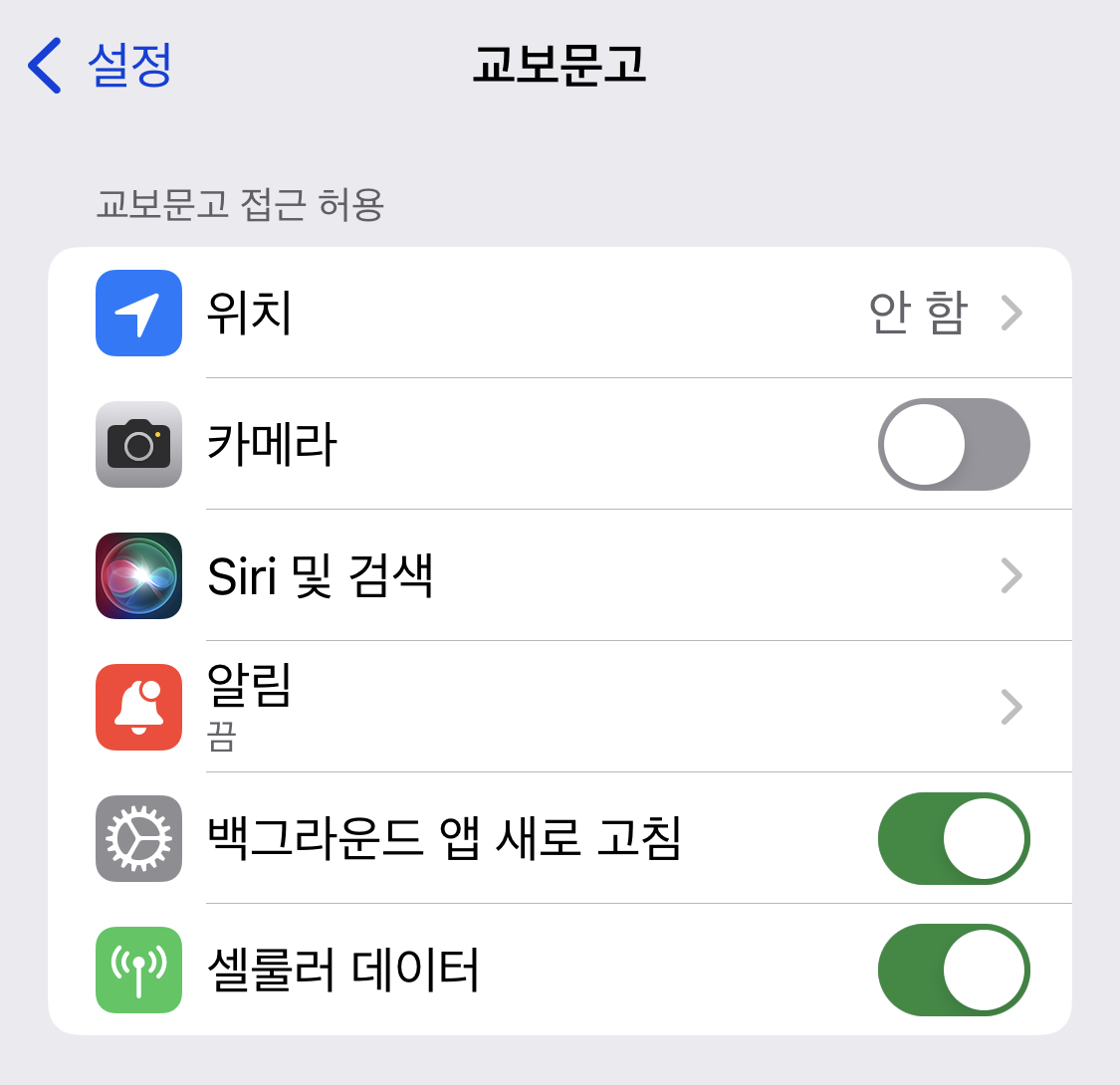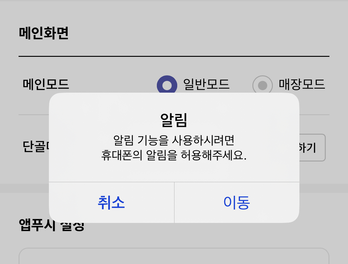 사실 저는 많은 경우 알림을 사용하지 않습니다. 제 틱틱 어플을 제외하면요. 그래서 위와 같은 메시지가 나타납니다. 휴대폰 자체에서 알림을 허용해놓아야 앱푸시 설정 버튼이 On으로 바뀝니다. "이동"을 눌러서 스마트폰 설정 자체로 들어갑니다.
