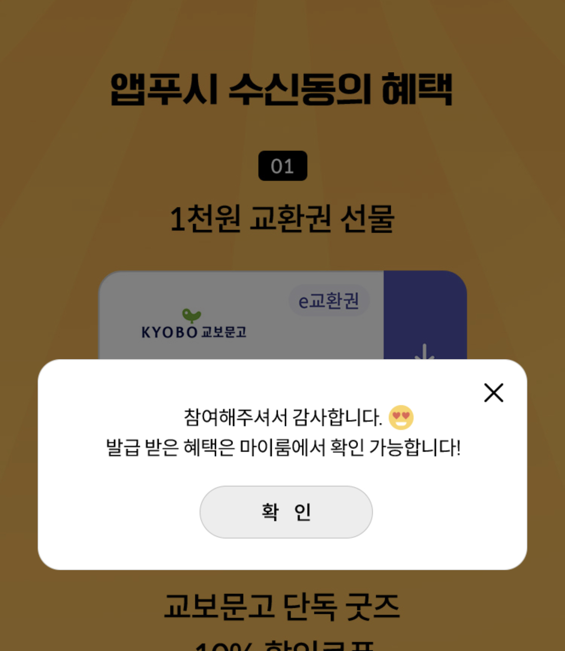 이후 앱푸시 수신동의 이벤트 맨 위에 있던 다운로드 화면(1천원 교환권 선물)을 눌러주면 교환권을 얻게 됩니다.