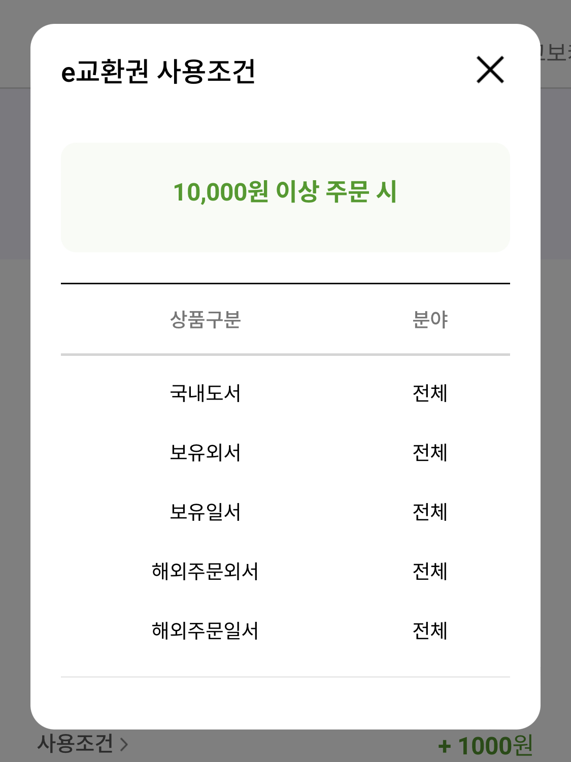 앱푸시 수신동의로 받은 e교환권은 10,000원 이상 주문 시 도서 전체 분야에서 사용 가능한 것 같습니다. 사용 가능한 영역을 꼭 확인하시고 발급받으시기를 바래요.