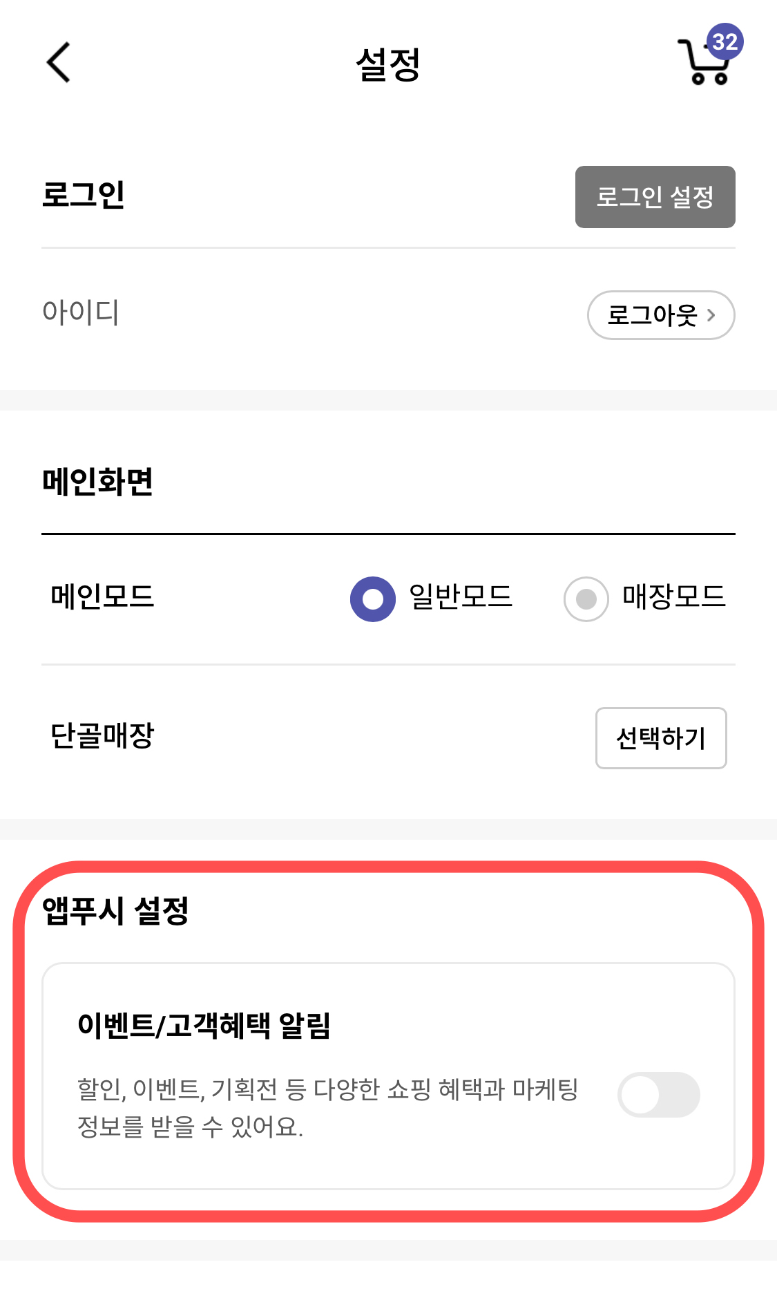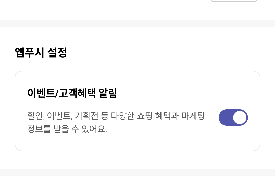 저는 아이폰을 사용 중이라 화면이 이렇게 나옵니다. 설정 화면이죠. 아래에 "앱푸시 설정"이 있습니다. 이벤트/고객혜택 알림 부분이 Off로 되어 있죠. 여기서 On으로 바꾸면 되는데요.