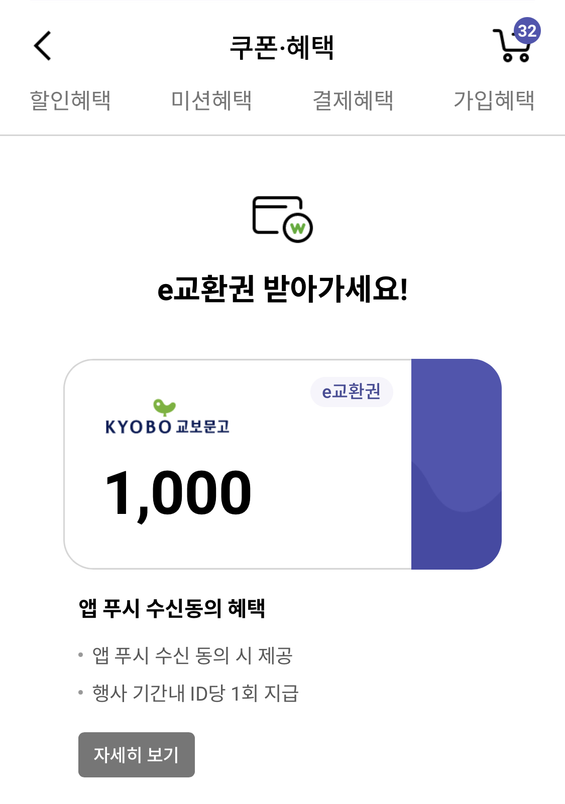 먼저 모바일 교보문고에서 "할인혜택"을 눌러서 들어갑니다. 여러 혜택 중에 가장 위에 있을 거예요. 행사 기간 내에 ID당 1회 지급 가능합니다. "자세히 보기"를 누릅니다.