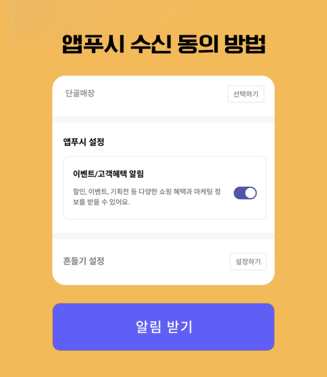다음으로 나온 화면에서 이렇게 다운로드 받을 수 있는 부분이 먼저 나오는데요. 앱푸시 수신동의를 이미 해두였다면 바로 교환권을 받으실 수 있습니다. 만약 저처럼 매번 수신동의를 온오프 하셔서 꺼져있다면, 더 아래로 내리셔서 "알림 받기"를 눌러주세요.