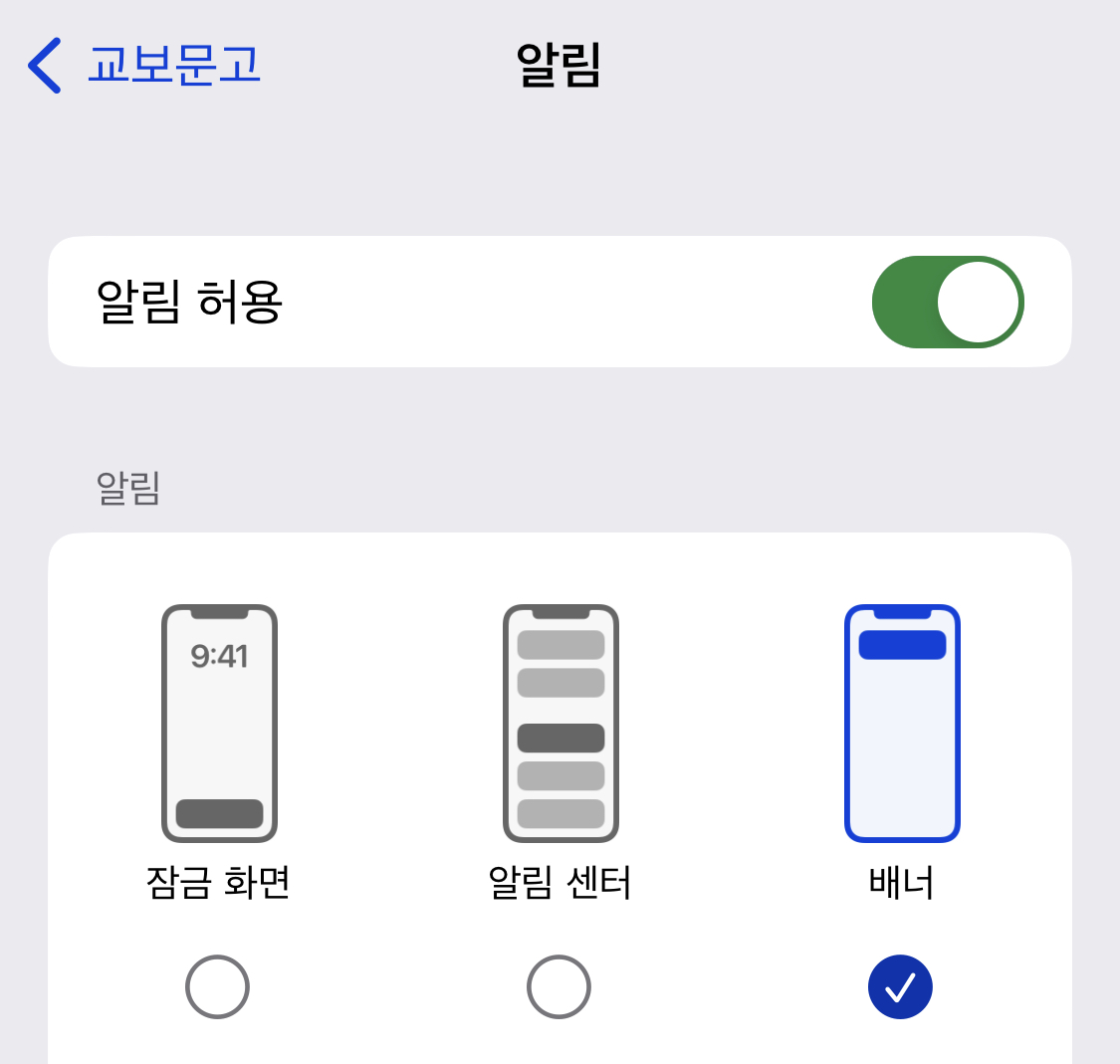 왼쪽 화면이 먼저 뜰 겁니다. 알림 부분이 "끔"으로 되어 있죠. 들어가셔서 알림 허용을 On으로 바꾸어줍니다. 어차피 이후 다시 Off할 예정이니 시원하게 눌러줍니다.