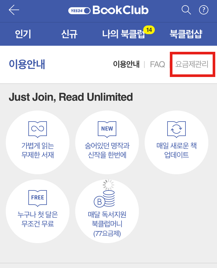 5. 자, 해지 예약을 해야할 차례입니다. "북클럽샵" 아래에 있는 "요금제 관리"를 눌러주세요.