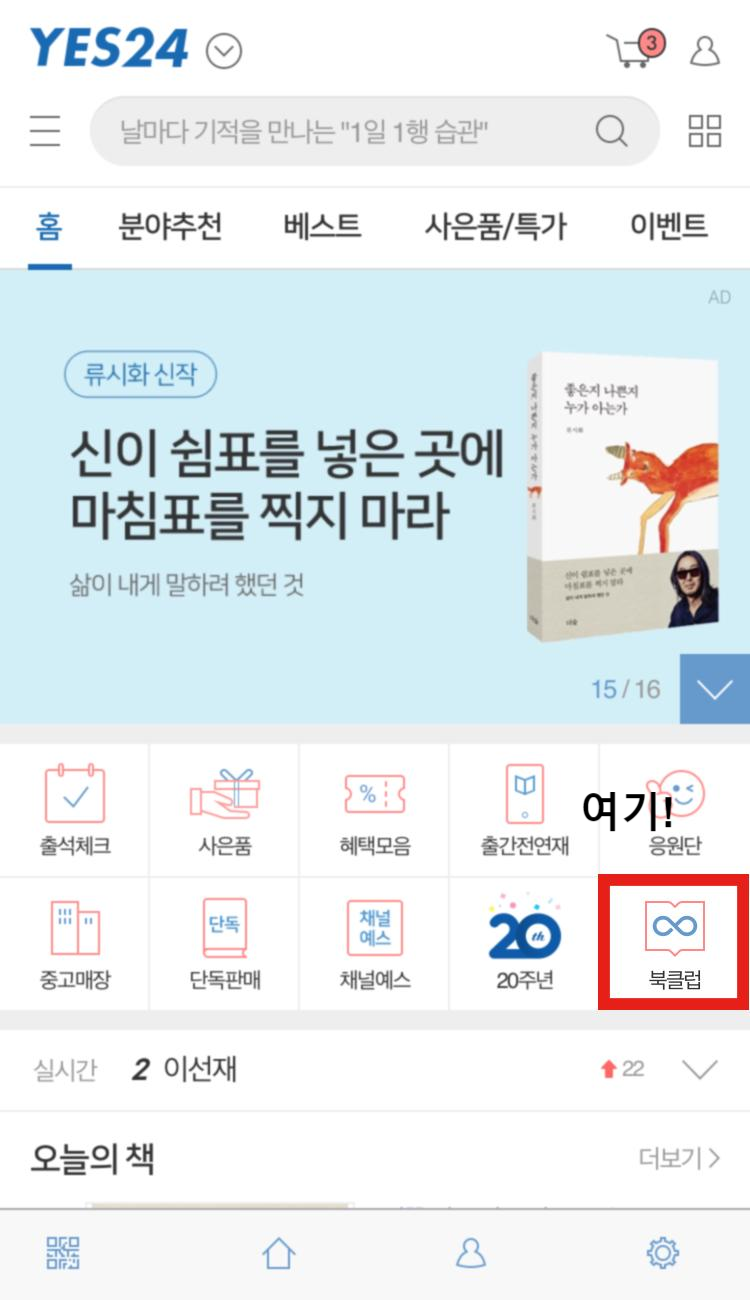 1. 어플의 첫 화면에서 중간에 "북클럽" 메뉴가 있습니다. 이걸 눌러주세요..