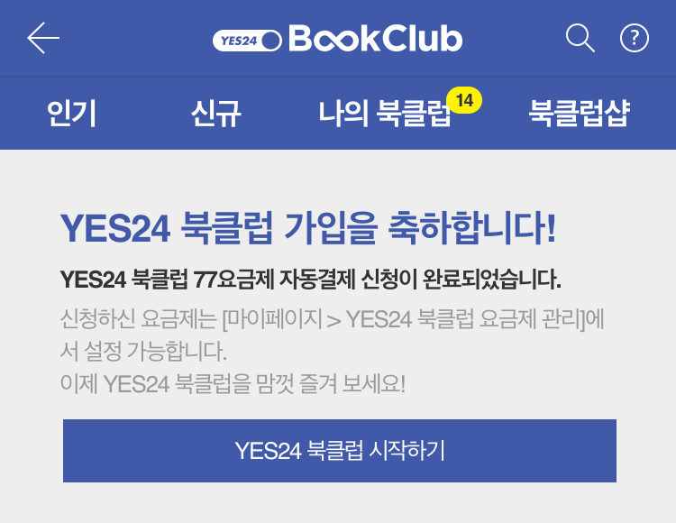 한달 후 계속 yes24 북클럽을 이용할 계획이 없으시거나 안전빵을 원하시는 경우에 눌러주세요.