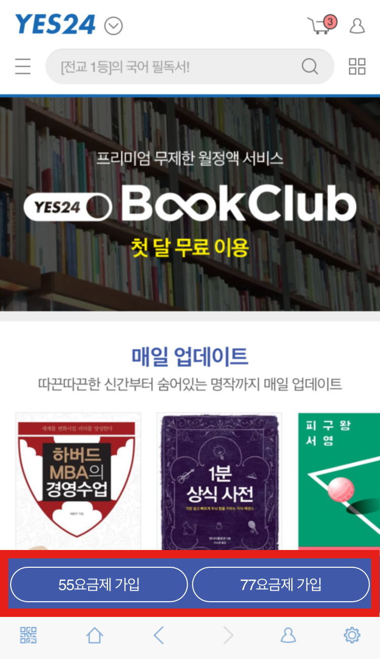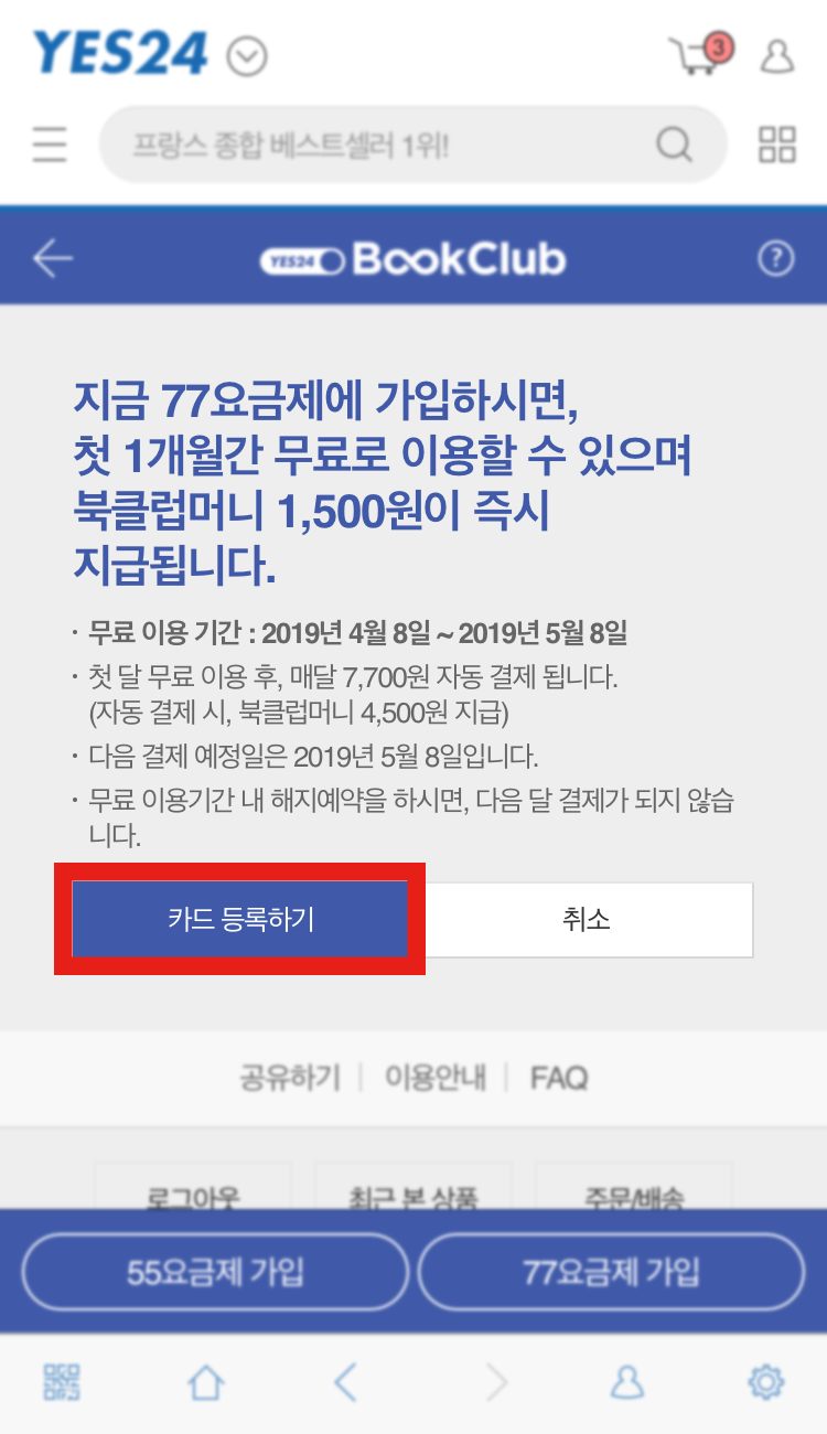저는 느낌상 yes24북클럽을 계속 이용할 것 같아 "77요금제 가입"을 눌렀어요.