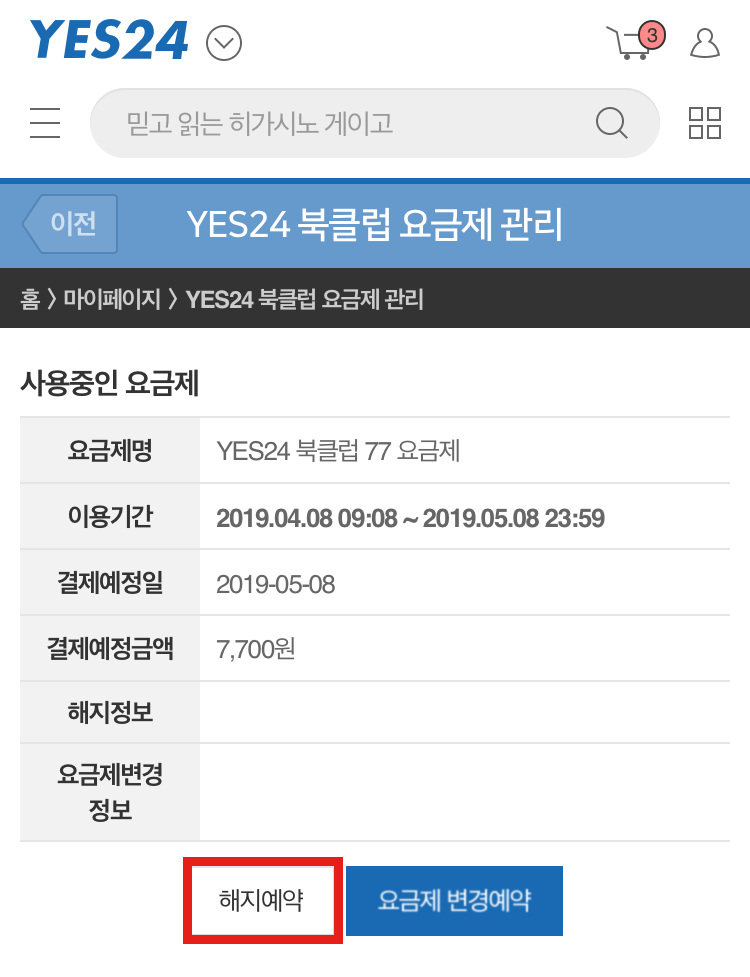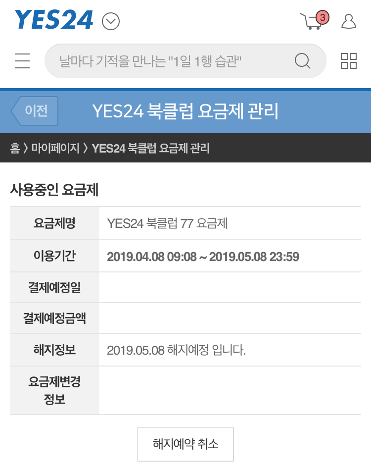 저는 이렇게 해지예약을 신청해놓고 yes24 북클럽을 이용하고 있답니다.