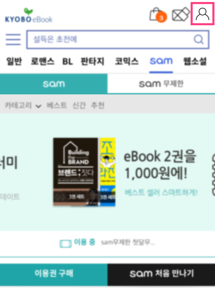 로그인을 하셨다면 교보문고 ebook페이지의 우측 상단의 사람을 누릅니다.